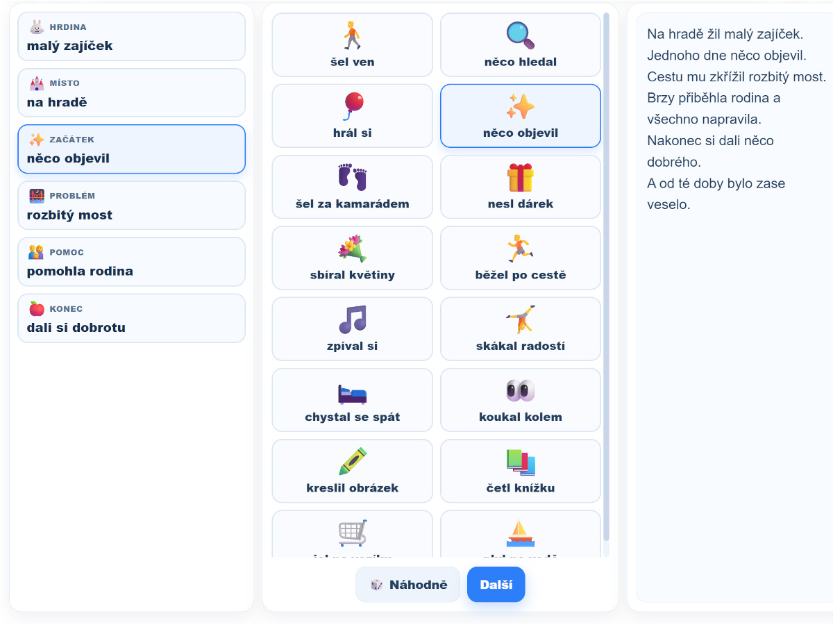 Aplikace podporuje rozvoj komunikativních kompetencí, předčtenářské gramotnosti, tvořivého myšlení a schopnosti vyprávět. Dítě chápe posloupnost děje, pracuje s příčinou a následkem, vybírá řešení problémové situace a učí se formulovat vlastní příběh. Při společné práci rozvíjí i sociální a personální kompetence, domluvu a spolupráci.